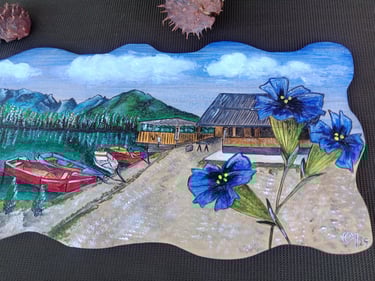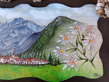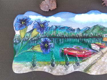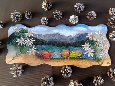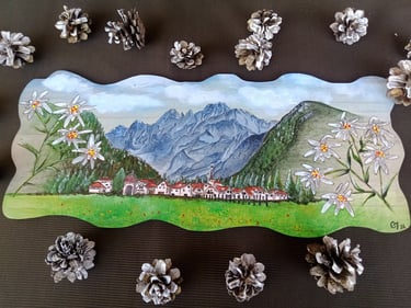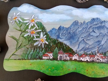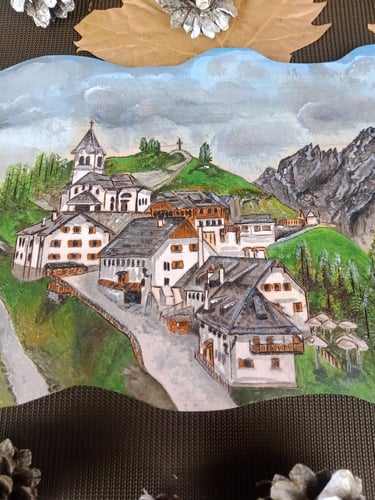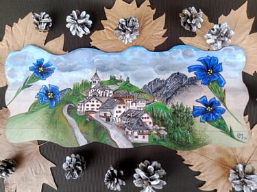 Dipinti realizzati con colori acrilici su sezioni di tronco e pannelli in legno naturale non trattato. Vi sono ritratti alcuni degli scorci più incantevoli del Tarvisiano: i laghi di Raibl e Fusine, il fiabesco villaggio di Valbruna, la chiesa dei SS. Pietro e Paolo a Tarvisio, il Monte Santo Lussari con il suo caratteristico borgo.